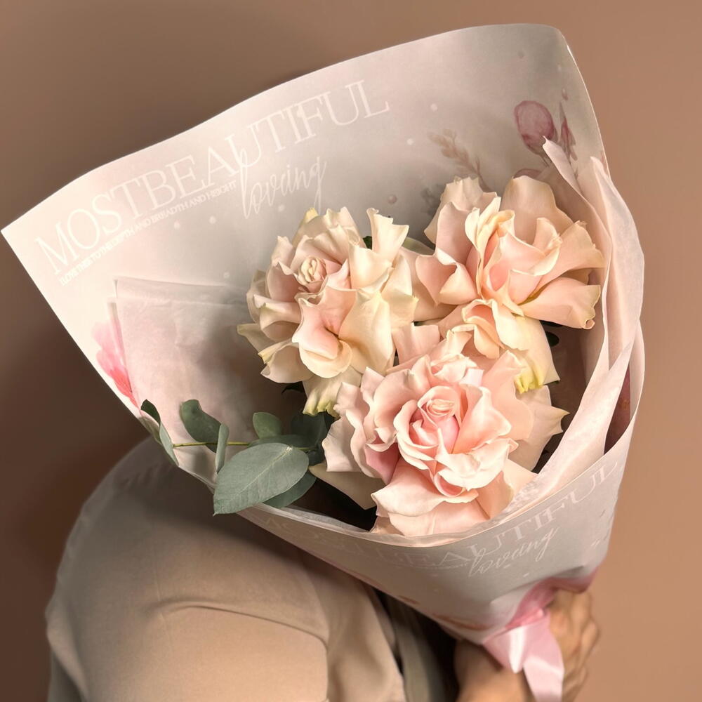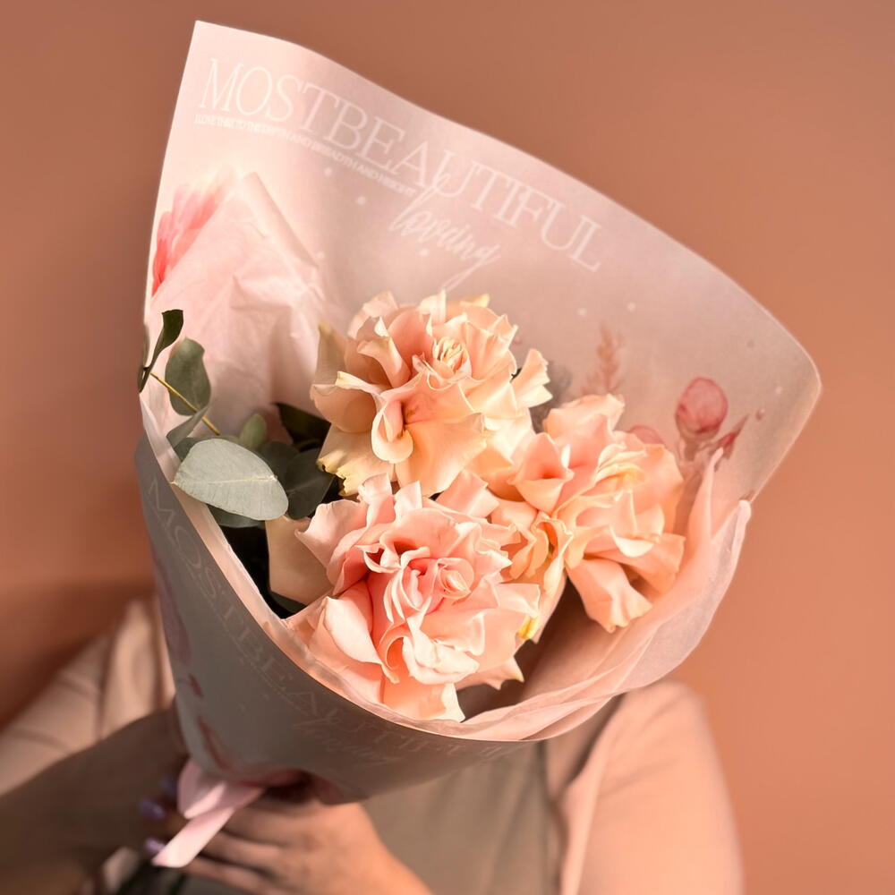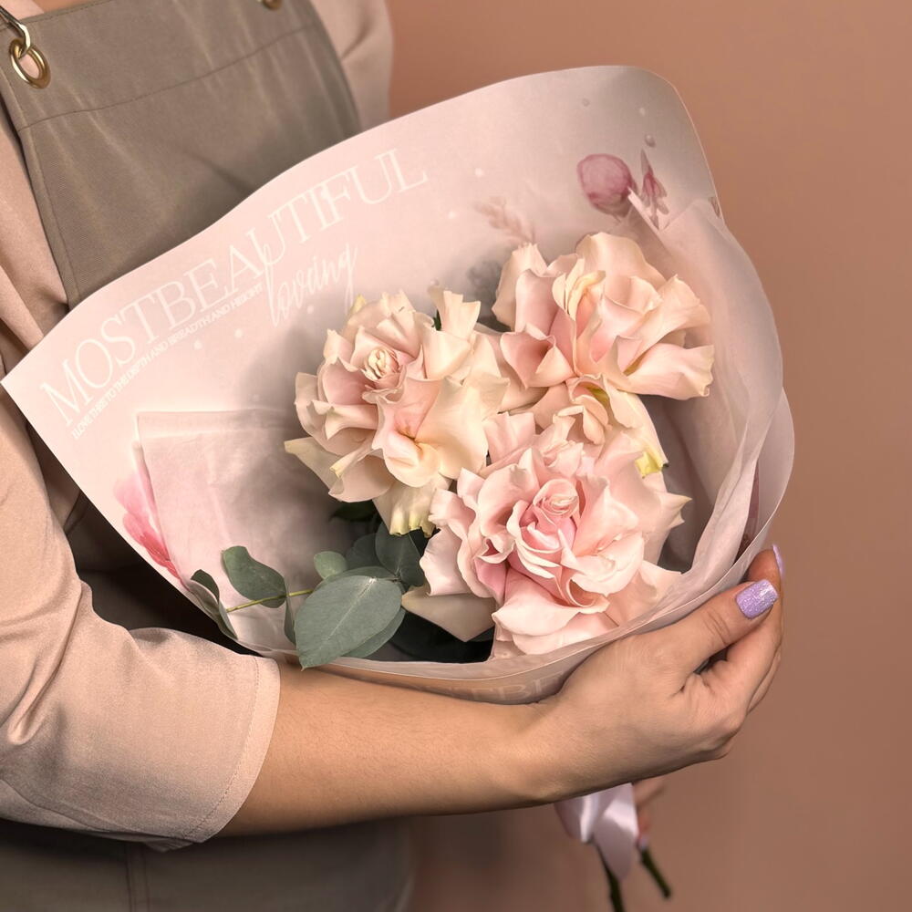 Миниатюрный комплимент, составленный из трёх ароматных французских роз мягкого пастельного оттенка в сопровождении изящной веточки эвкалипта. Это утончённое и лаконичное проявление симпатии, благодарности или желания поднять настроение без громкого повода. Оптимальное решение для небольшого презента девушке, подруге, коллеге или маме, а также для встречи на первом свидании или жеста «без причины».
